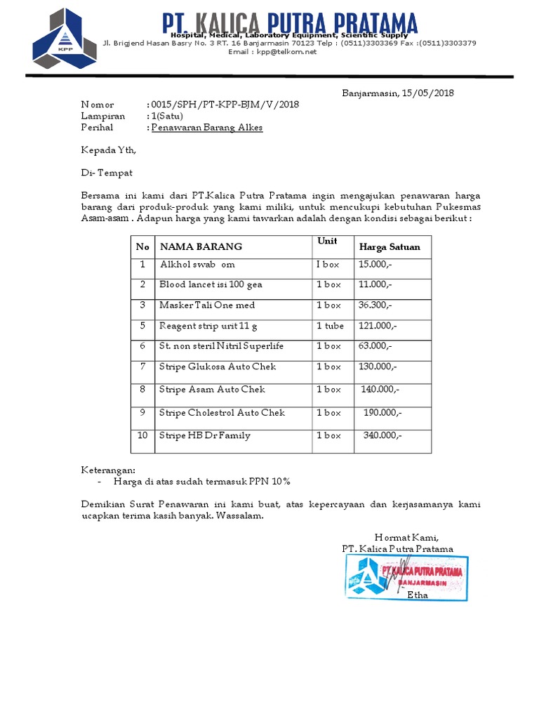 Permintaan penawaran harga diajukan oleh pelaksana kegiatan (dalam hal ini tpk dana desa) apabila nilai pengadaan barang/jasa di atas rp. Tujuan dibuat surat penawaran ini, supaya jasa atau barang yang anda tawarkan bisa berjalan dengan lancar. Surat penawaran harga adalah surat yang dibuat oleh sebuah instansi untuk keperluan menawarkan harga dari suatu produk yang dibuat atau dipasarkan kepada perusahaan ataupun pihak lain. Pada umumnya, surat penawaran ini berbentuk secara resmi. Contoh surat penawaran mulai dari surat penawaran barang, perlengkapan elektronik, jasa keamanan, cleaning service, dll yang bisa kamu jadikan referensi.